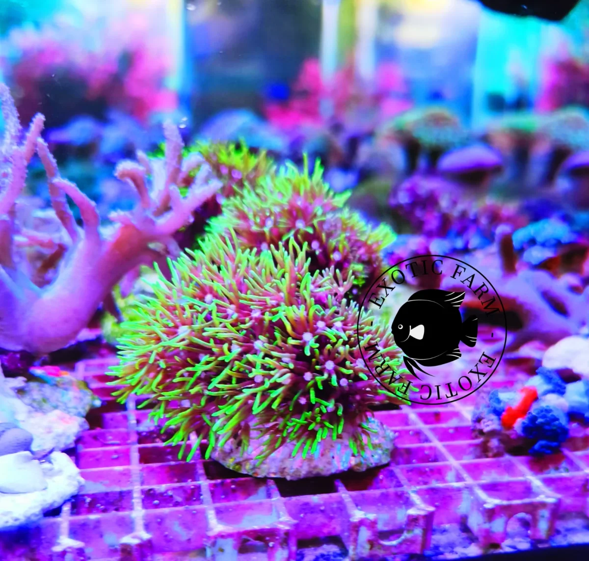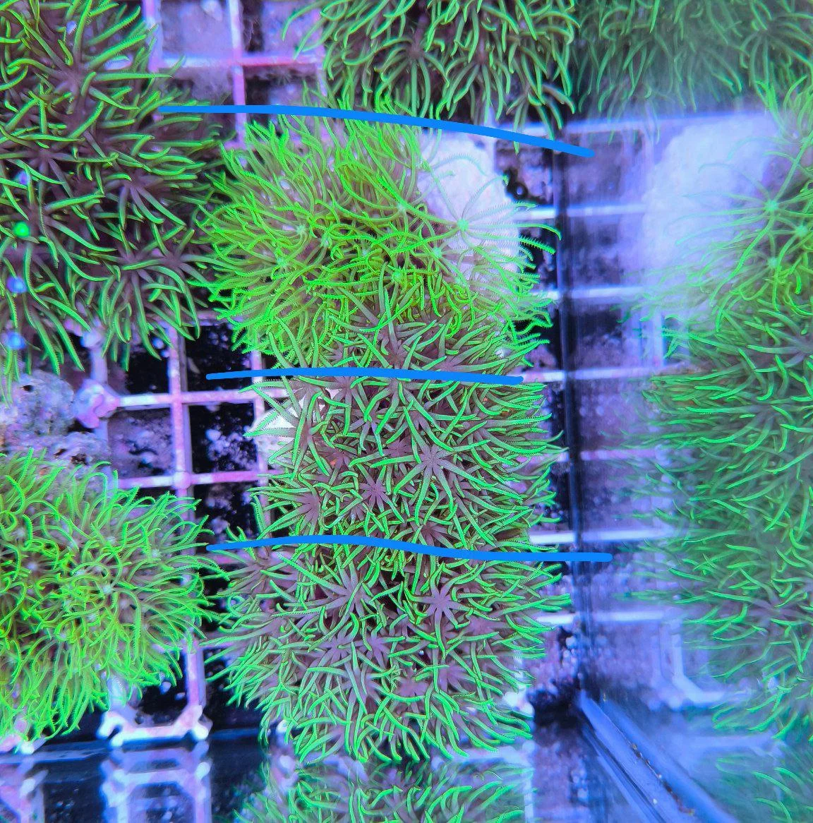 La Clavularia viridis è un corallo molle dal forte impatto visivo, celebre per i suoi polipi sottili e allungati di un verde brillante, capaci di creare un vero e proprio tappeto pulsante sulla rocciata. È una specie che unisce colore intenso e movimento continuo, rendendo il reef immediatamente più vivo e dinamico. La colonia cresce in forma incrostante, espandendosi progressivamente sulla superficie rocciosa tramite un tessuto basale sottile ma resistente. Da questa base emergono numerosi polipi slanciati, ben distanziati e regolari, che oscillano delicatamente con il movimento dell’acqua, creando un effetto naturale e rilassante. Con un’illuminazione ricca di tonalità fredde,…