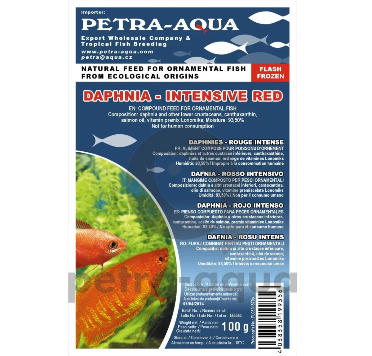 blister da 100 grammi di daphnia (di allevamento) congelata arricchita con elementi che rafforzano il rosso dei pesci