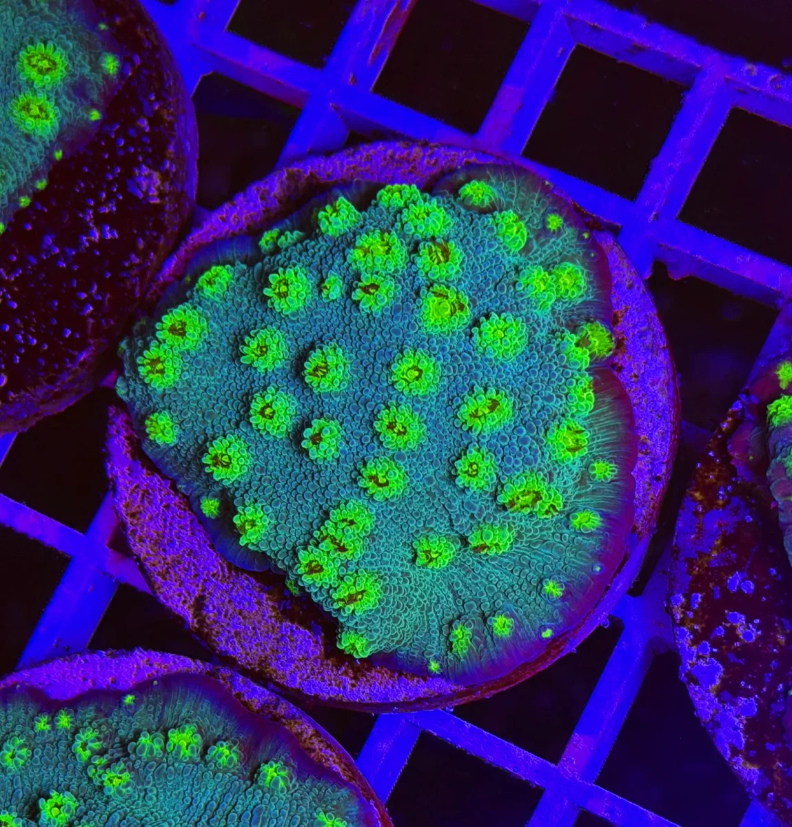 La Echinopora Hollywood Stunner è un corallo LPS molto apprezzato per la sua crescita a piatto e a mensola, che crea forme ondulate e stratificate estremamente scenografiche. La sua colorazione viola intenso con margini verde fluo acceso la rende uno dei coralli più iconici e ricercati nel mondo reef, capace di risaltare in modo spettacolare sotto illuminazione LED. È una specie resistente e relativamente facile da gestire, ideale sia per acquariofili esperti che per appassionati con una buona stabilità di vasca. Predilige illuminazione da moderata a intensa e ottima movimentazione dell’acqua, condizioni che le permettono di sviluppare margini vivi, calcificanti…