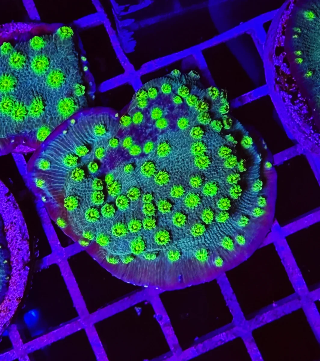Corallo LPS di facile gestione. riesce a crescere nelle più disparate situazioni, chiaramente se messa nelle condizioni migliori quindi tanta luce e triade ben gestita, in poco tempo riuscirà a crescere e ampliarsi tantissimo. cresce creando dei “ventagli” rigidi nella parte media-alta della vasca Somiglia tantissimo alla montipora capricornis green, ma in realtà ad oggi è classificata come LPS, infatti durante le ore di buio potrete vedere i suoi lunghi polipi trasparenti estroflettersi. foto reali, ogni quadretto della griglia misura 1,7 cm