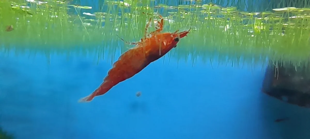 Caridina red cherry, taglia sui 2-2.5cm da allevare in acqua possibilmente tenera e in gruppo.