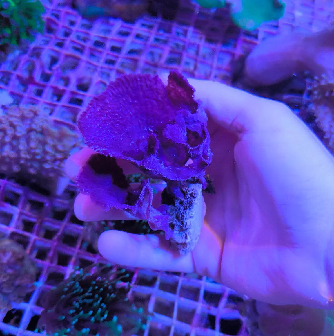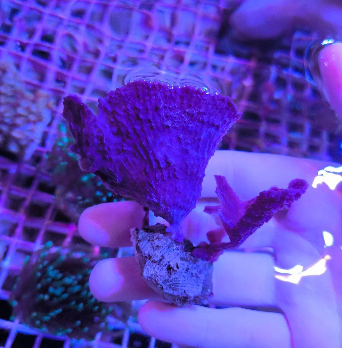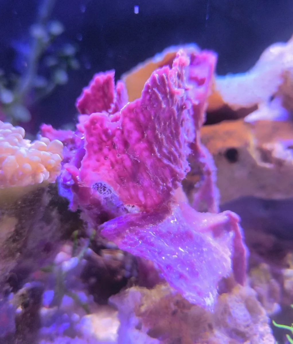 utilissima spugna da tenere in acquario Se l’acqua è molto magra stenta a crescere quindi in vasche troppo “tirate” nella gestione potrebbe non crescere molto In piena luce diventa viola molto chiaro tendente al rosa in ombra invece viola scuro o blu. foto della galleria (non di copertina) reale, quella è la mia mano serve a darvi un’idea della dimensione reale, centimetro più – centimetro meno