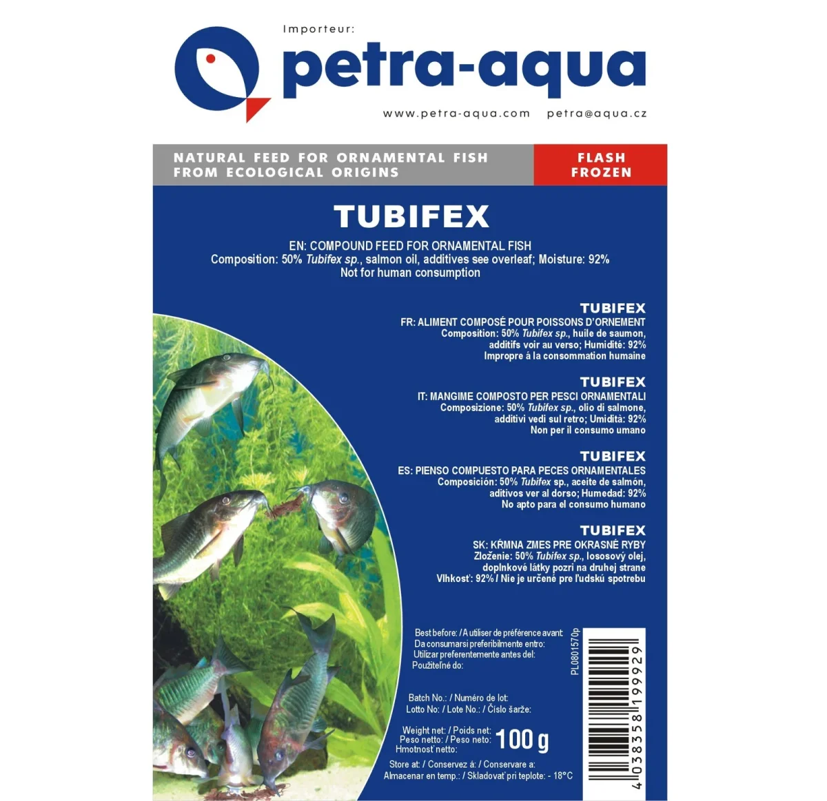 blister da 100 grammi di tubifex, si tratta di tubifex allevati in modo controllato, esente da qualsiasi tipologia di patogeni e parassiti.