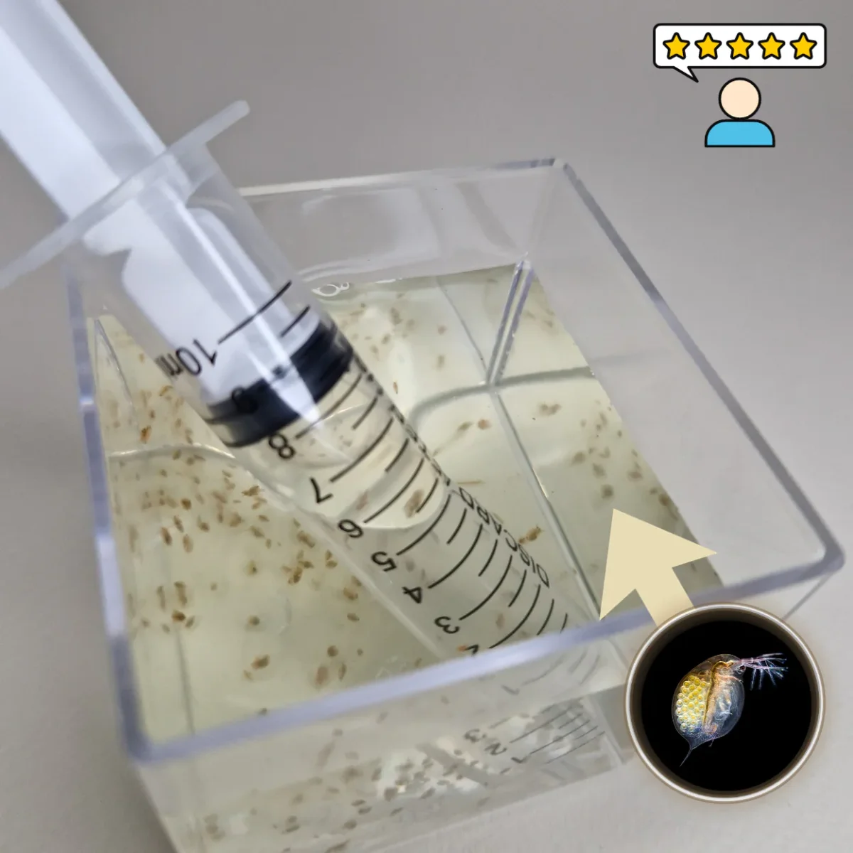 Vous pourrez ensuite effectuer vos premières récoltes à l’aide de l’épuisette aux mailles adaptées. Le cube de tri ultra-transparent vous permettra de choisir les plus grosses ou plus petites daphnies, selon vos besoins, que vous prélèverez à l’aide de la seringue incluse.
