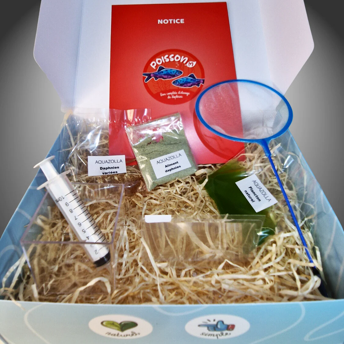 Ce coffret contient bien sûr vos premières daphnies vivantes, qui seront votre souche de départ, mais aussi une notice complète et simple qui vous guidera pas à pas.